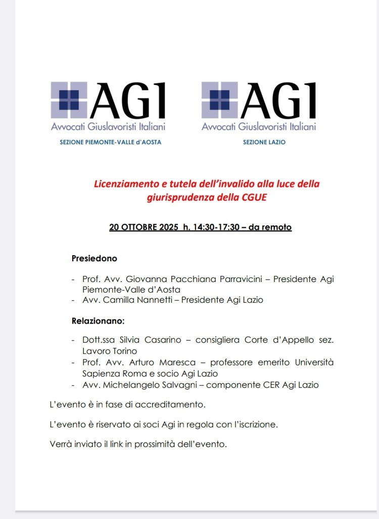 “LICENZIAMENTO E TUTELA DELL’INVALIDO ALLA LUCE DELLA GIURISPRUDENZA DELLA CGUE” che si terrà lunedì 20 ottobre 2025, dalle ore 14:30 alle ore 17:30.