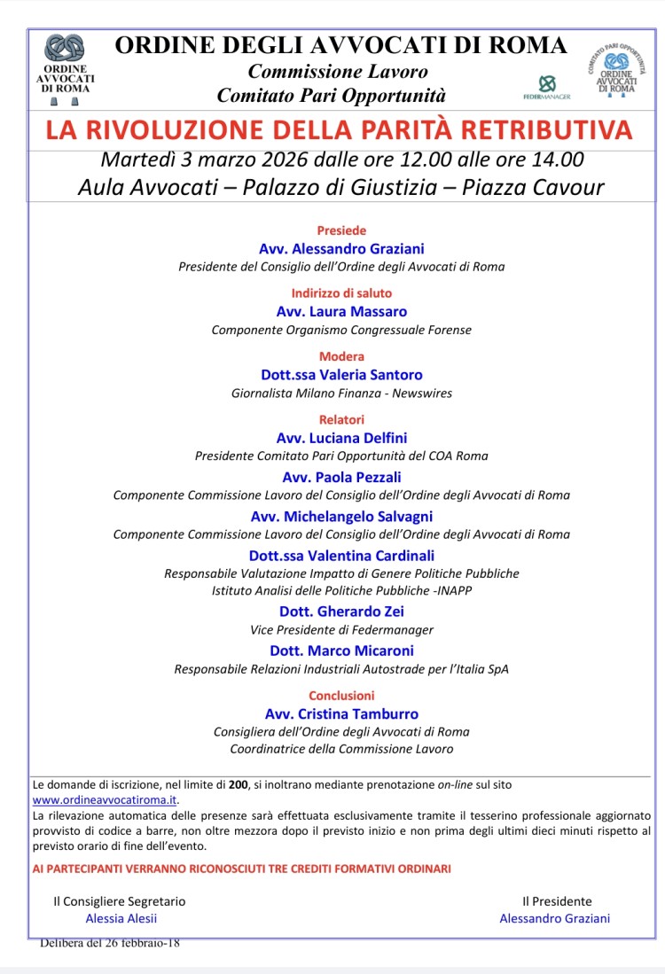 Segnalo la mia partecipazione, in qualità di relatore, al Convegno che si terrà martedì 3 marzo 2026, dalle ore 12:00 alle ore 14:00, dedicato al tema: “La rivoluzione della parità retributiva”.